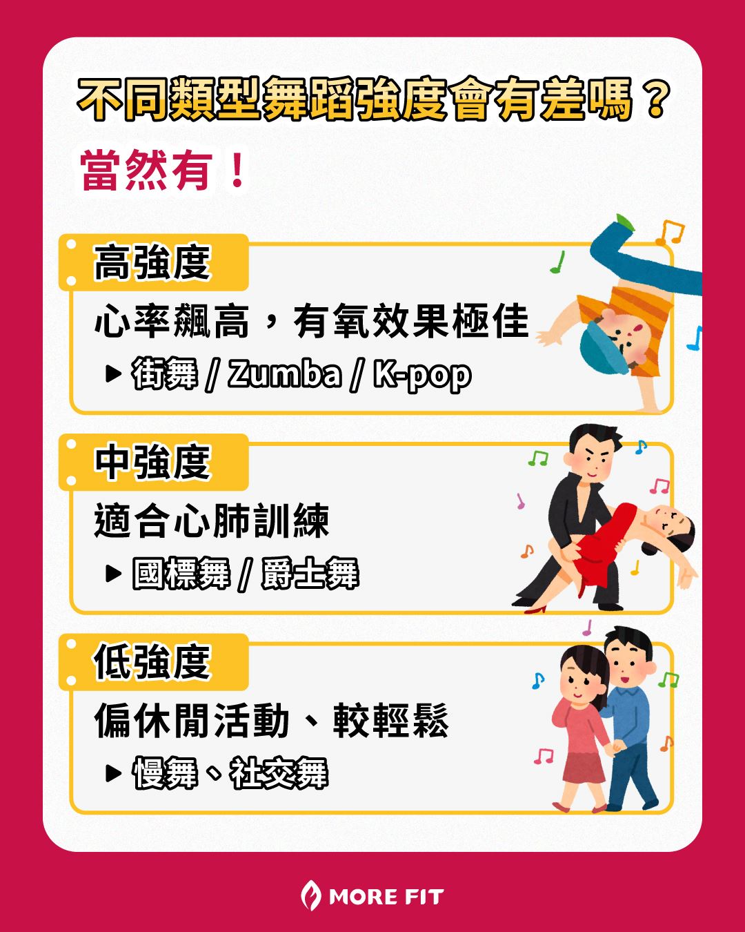 • 慢舞、社交舞 → 強度較低,偏休閒活動