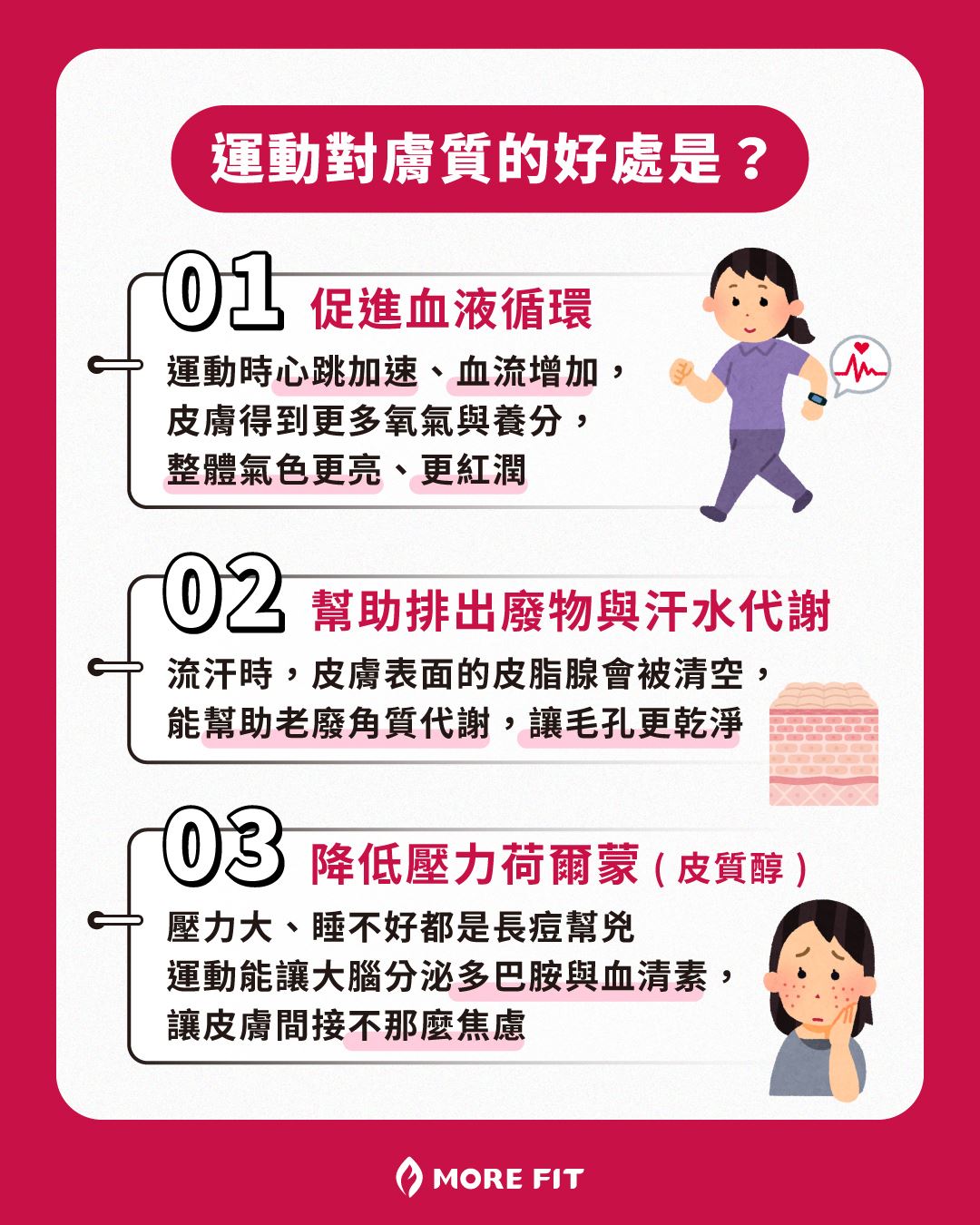 壓力大、睡不好都是長痘幫兇🥲而運動能讓大腦分泌多巴胺與血清素,讓皮膚間接「不那麼焦慮」