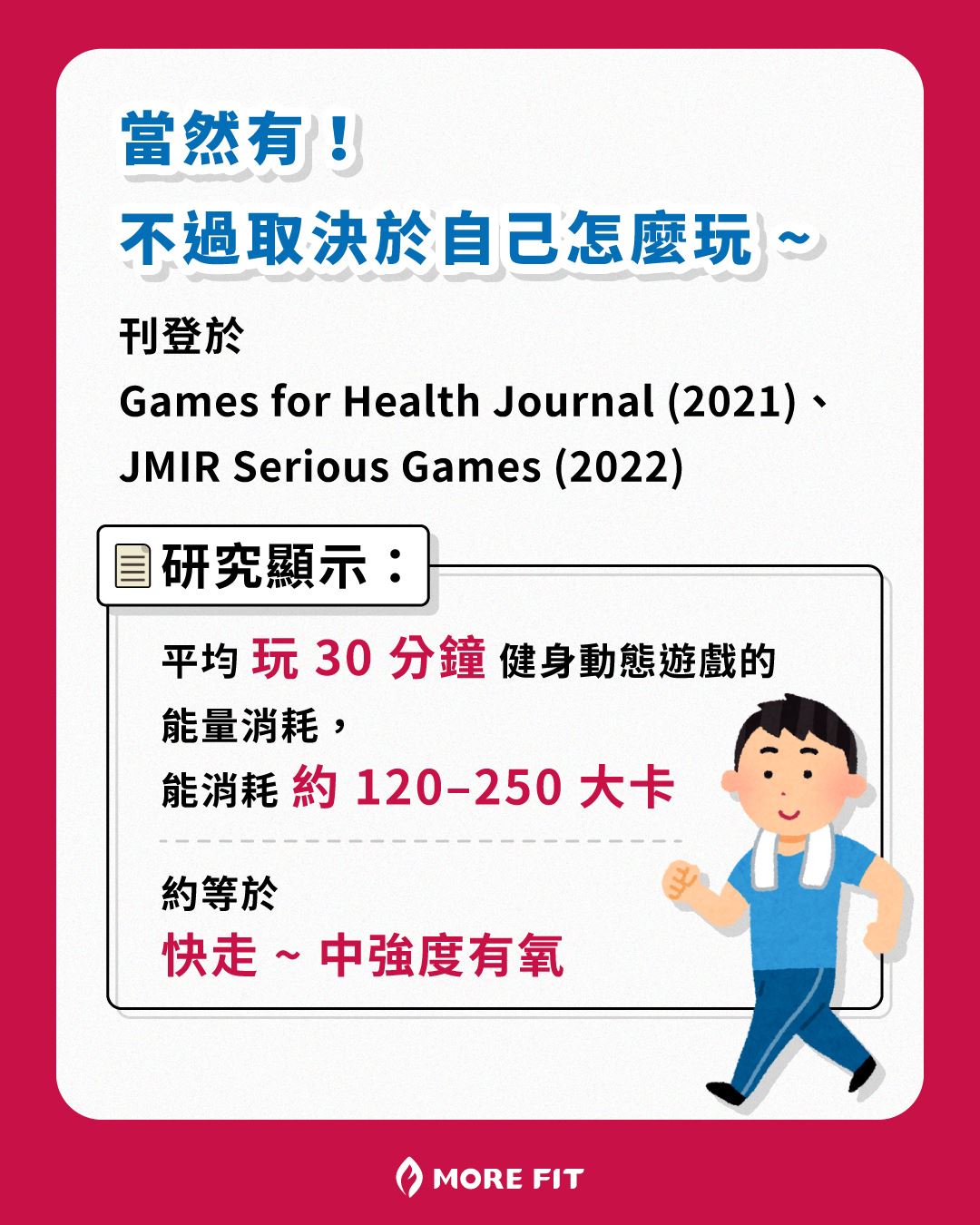 平均玩 30 分鐘健身動態遊戲的能量消耗,能消耗約 120–250 大卡