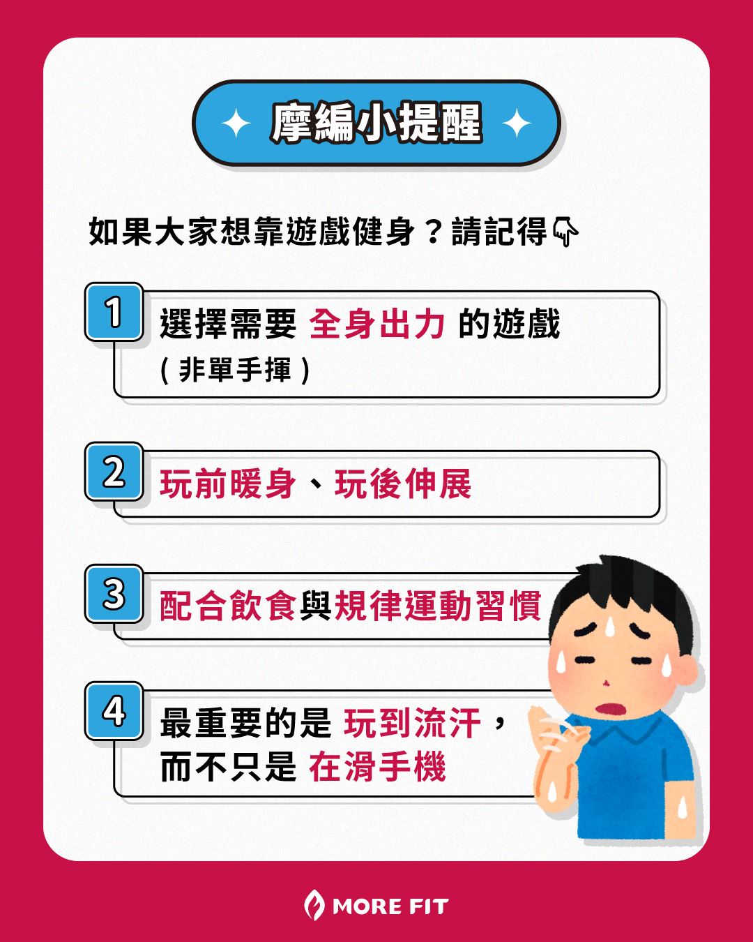 所以呀~如果大家想靠遊戲健身?請記得以下幾個小提醒: