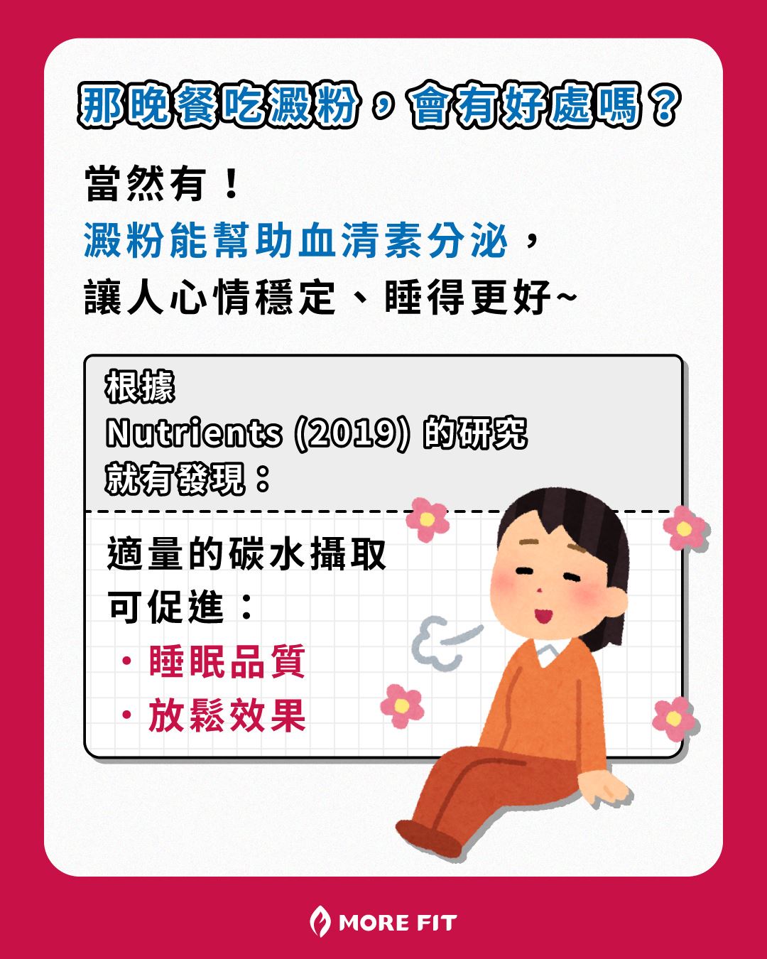 📚 Nutrients (2019) 的研究就有發現:適量的碳水攝取可促進睡眠品質與放鬆效果💡