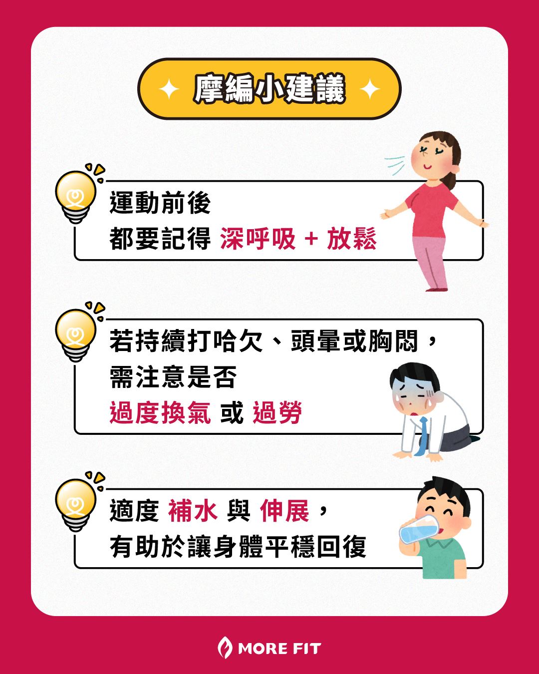 ✅ 若持續打哈欠、頭暈或胸悶,就需注意是否過度換氣或過勞