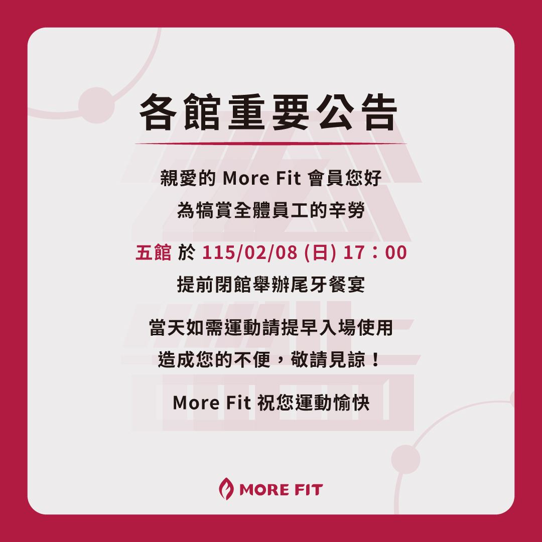 親愛的 More Fit 會員您好 為犒賞全體員工的辛勞 五館 於 115/02/08 (日) 17:00 提前閉館舉辦尾牙餐宴 當天如需運動請提早入場使用 造成您的不便,敬請見諒! More Fit 祝您運動愉快