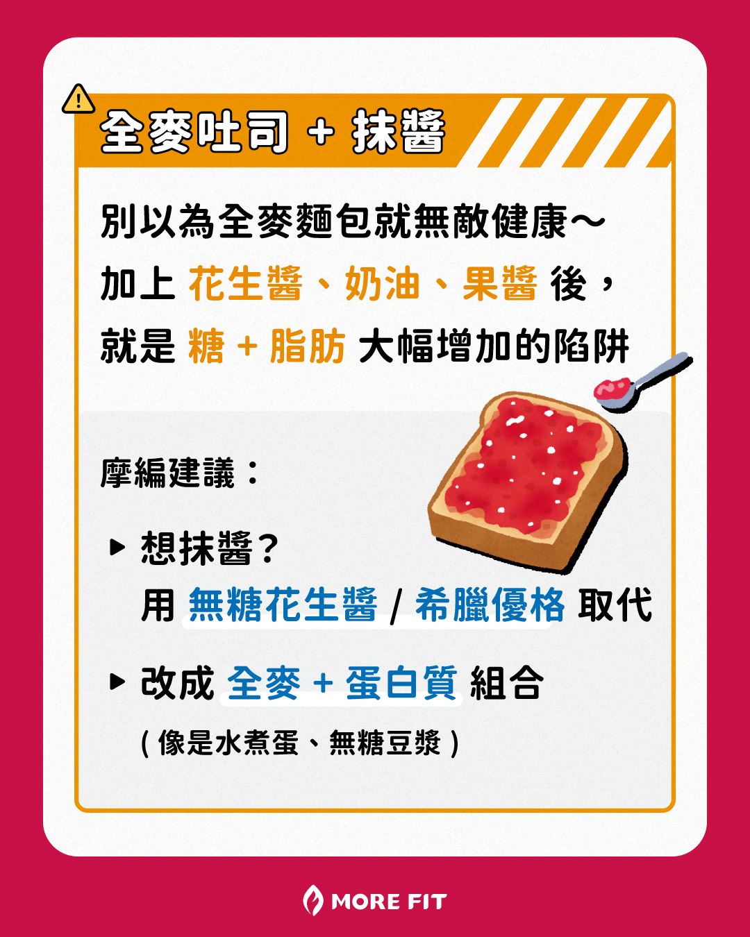👉 改成「全麥+蛋白質」組合(像是水煮蛋、無糖豆漿)